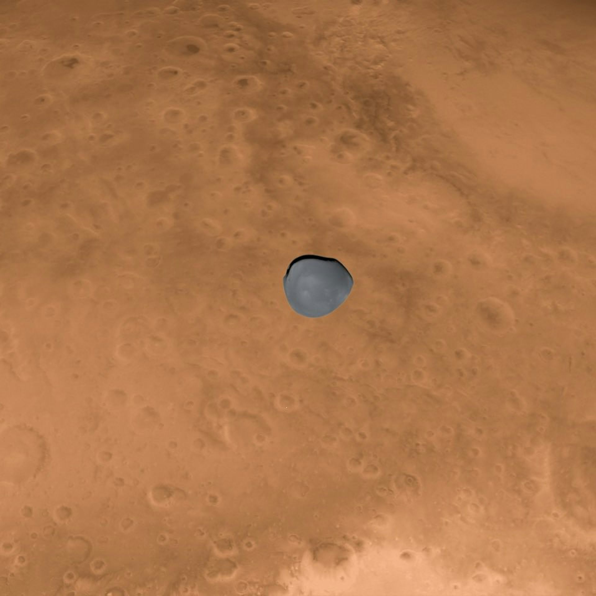 En esta imagen, se quitaron 1,000 km, apreciamos el planeta rojo rojo porque refleja la luz solar dominante. Mientras que órbitas de aproximadamente 23,500 km de la superficie de Marte y se sincronizó en su rotación, ese lado de la luna rara vez estaba atrapado.