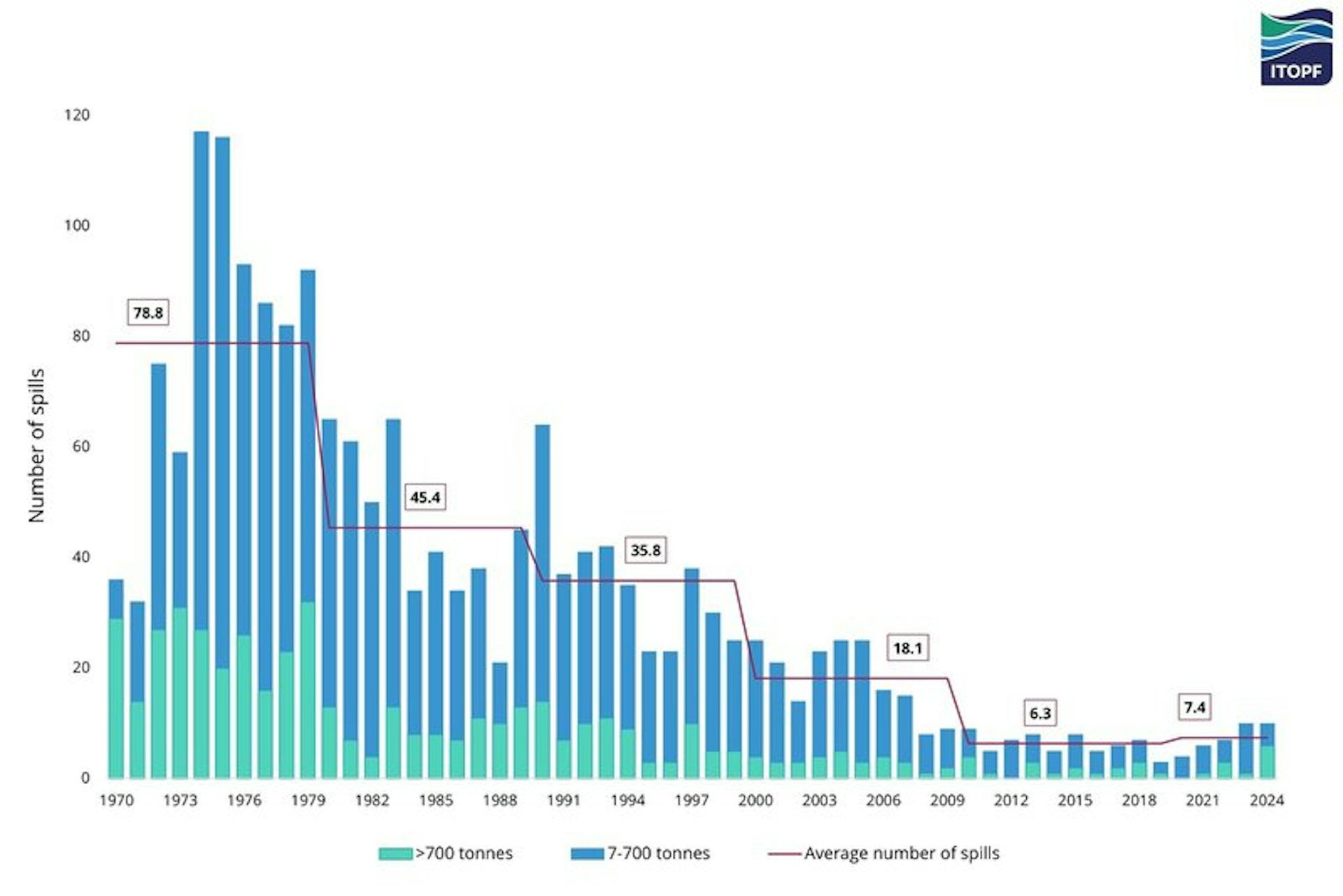 La información sobre los derrames principales es más confiable y de acuerdo con los datos que se observan que un número de 7 a 700 toneladas y más de 700 toneladas y decididamente reducidas cada década en el período 1970-2019.