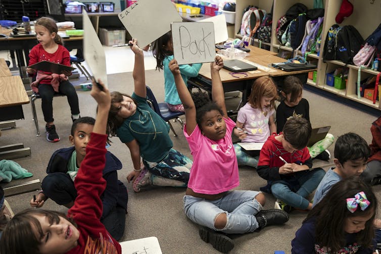 Los alumnos de primer grado en Springfilfield, VA. Durante la lección de lectura en la Escuela Primaria Hunt Valley 3. Noviembre de 2022. Jahi Chikvendiu / The Washington Post a través de Getta Images