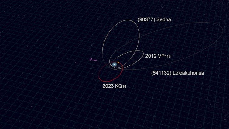 Una órbita de amonidad (rojo) en comparación con las órbitas de los otros tres dedo (vacíos). Se detectó 2023 KC₁₄ cerca de su Perihelio a una distancia de 71 Au. El punto amarillo indica su posición actual. Crédito: Najo.