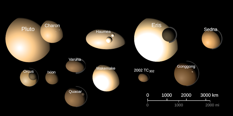 Ilustración de las principales instalaciones transneptunicas (TNO) ubicada en el sistema exterior del sistema solar, señalando corcho, eris, macacae y sedes. Préstamos: Wikipedia Commons.