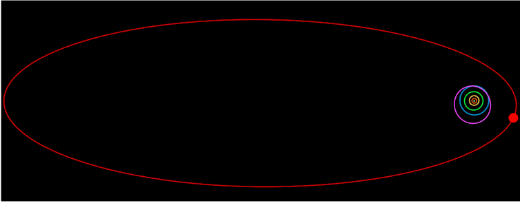 Comparación entre la órbita de los planetas enanos Sedia (en rojo) y los planetas del sistema solar (diferentes tonos) alrededor del sol. Puede ver un amplio nombre de SEDN de semi-paquete (aproximadamente 506 UA), así como una gran excentricidad o "nivelar" su órbita. Crédito: Wikipedia Commons.