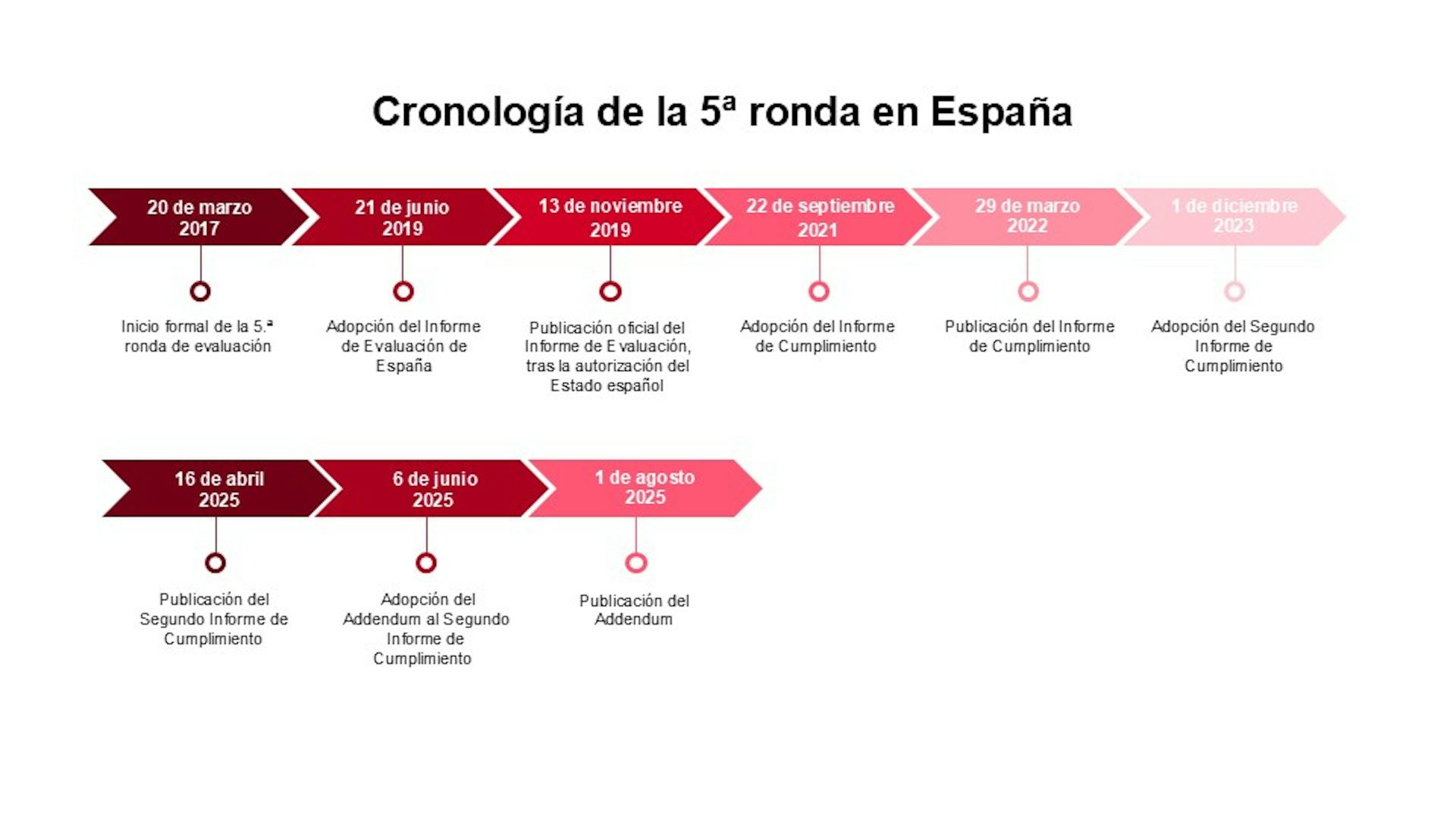 Greco controla el grado de cumplimiento de sus recomendaciones revisiones periódicas, como si fuera institucionalmente "ITV". Cada recomendación se describe como implementada, parcialmente implementada o no implementada.