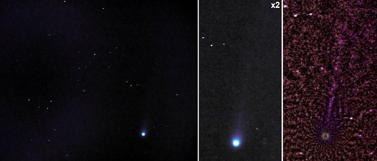 Imagen del cometa Lemmon del pasado jueves 16 de octubre. Exposición de 30 segundos desde el observatorio del Montseny, Riells y Viabrea, Girona. Vemos una apariencia más cercana a la que obtendríamos usando binoculares en un entorno semirrural, con su coma azul verdoso brillante y su cola tenue. El segundo panel muestra el cometa ampliado (x2), y el tercer panel desde la derecha muestra la desconexión de la cola y varios chorros de gas del núcleo, procesados con un filtro giratorio Larson-Sekanin. Josep M. Trigo (CSIC/IEEC), proporcionado por el autor (no reutilizar)