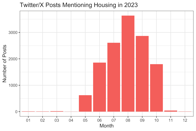 En agosto de 2023. Discusiones sobre el alojamiento en X Peak, con 3.638 mensajes mencionados por inmigración y vivienda. Este aumento significativo en las conversaciones de Internet coincidió con los comentarios públicos del gobierno federal que conectan a los estudiantes internacionales con la crisis de la vivienda. Los datos respaldan la idea de que los canadienses discutieron activamente la crisis de la vivienda con respecto a la inmigración en ese momento.
