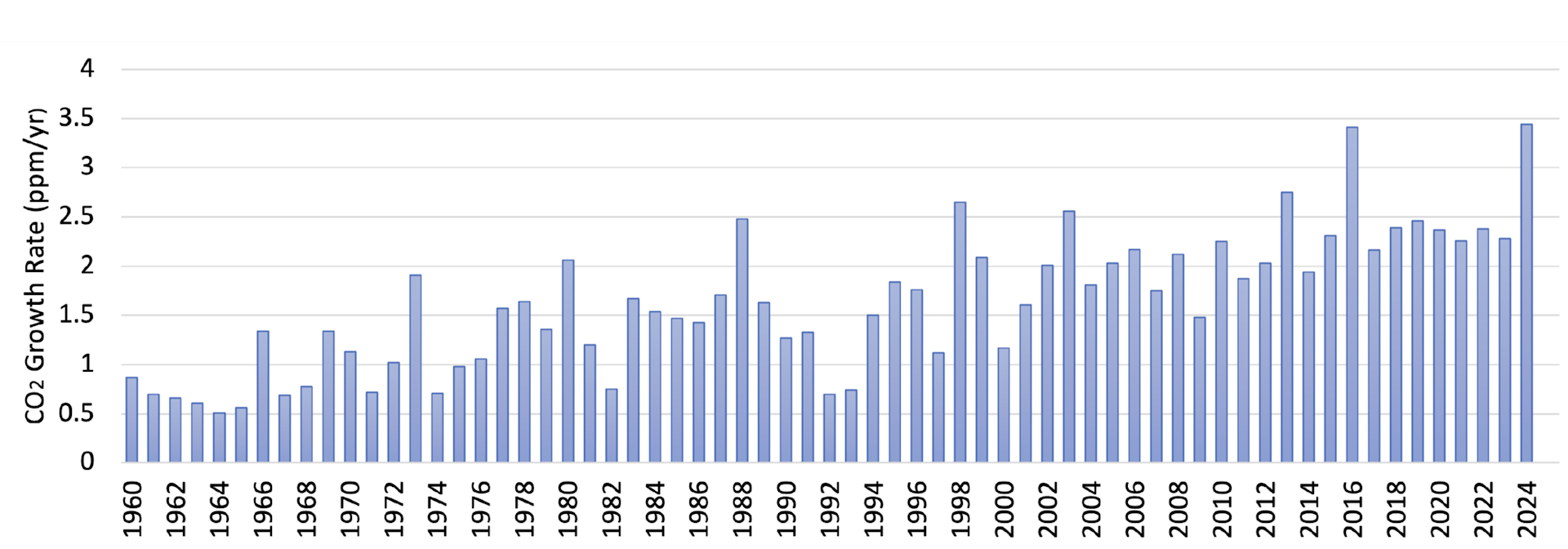 En la década de 1960, el CO₂ se acumulaba en la atmósfera a un ritmo de 0,8 partes por millón cada año (es decir, un aumento anual del 0,00008%). Este crecimiento se triplicó entre 2011 y 2020, alcanzando 2,4 ppm por año. Y la tasa de crecimiento del dióxido de carbono entre 2023 y 2024 aumentó a 3,5 ppm, el mayor aumento anual desde que comenzaron las mediciones modernas en 1957.