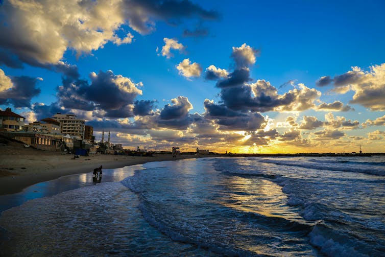 Gaza, frente al mar al atardecer, muestra el abrazo del mar y la luz; La destrucción se desmorona y renace la promesa de un nuevo amanecer. Alaa Mahdi Kudaih na Pekels