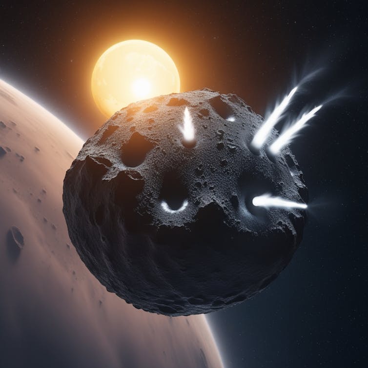 Concepto artístico del inicio de la actividad criogénica localizada del cometa interestelar 3I/ATLAS, aquí hipotéticamente representado cerca de Marte. Josep M. Trigo (CSIC/IEEC), proporcionado por el autor (no reutilizar)