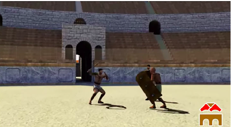 Lucha de gladiadores en una reconstrucción digital de Emerita Augustus desde la aplicación educativa de historia viva VirTimePlace