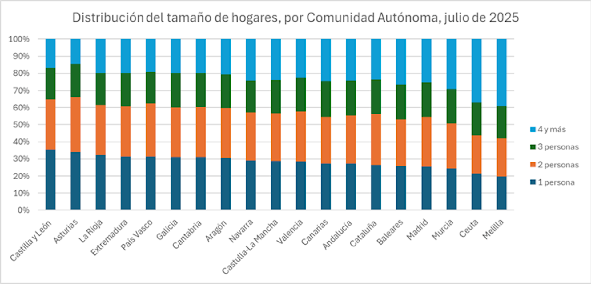 En julio de 2025, España tenía 19,6 millones de hogares. De este total, el 29% eran dos personas; 28%, empresarios independientes; el 23%, cuatro o más personas y el 20%, tres. Pese a su claro aumento, los hogares unipersonales no son el modo de vida más común en España, pero podrían serlo en los próximos años: aunque en julio de 2025 era más habitual vivir en hogares bipersonales, sólo había 130.520 más de este tipo respecto a los unipersonales. Y esta diferencia se redujo respecto a enero de 2021.