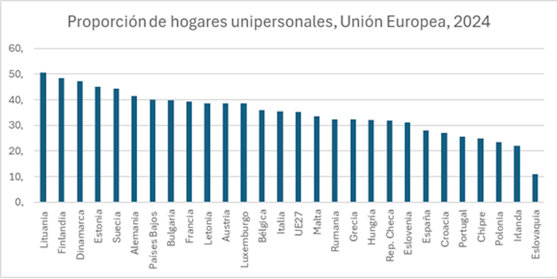 Si bien es cierto que en España cada vez hay más hogares unipersonales, su porcentaje no alcanza la media europea. En 2024, el 35% de los hogares de la Unión Europea estaban encabezados por una sola persona, frente al 28% en España. Desde 2015, la tendencia de este tipo de hogares ha ido aumentando en todos los países, aunque hay cuatro excepciones: Eslovaquia -donde la proporción de hogares unipersonales disminuyó significativamente entre 2015 y 2024-, Hungría, Irlanda y Polonia, donde el descenso fue mínimo, según Eurostat.