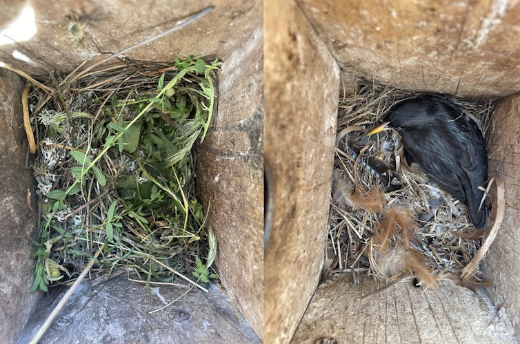 Diseño experimental para estudiar el efecto de la menta sobre las poblaciones de parásitos en nidos de herrerillos azules en Coimbra, Portugal. Cada díada de caja contenía un nido con pasto (a) y uno con menta (b) en la misma cantidad. Las plantas se recogieron, secaron y pesaron (c) para examinar su efecto. Ana Claudia Norte