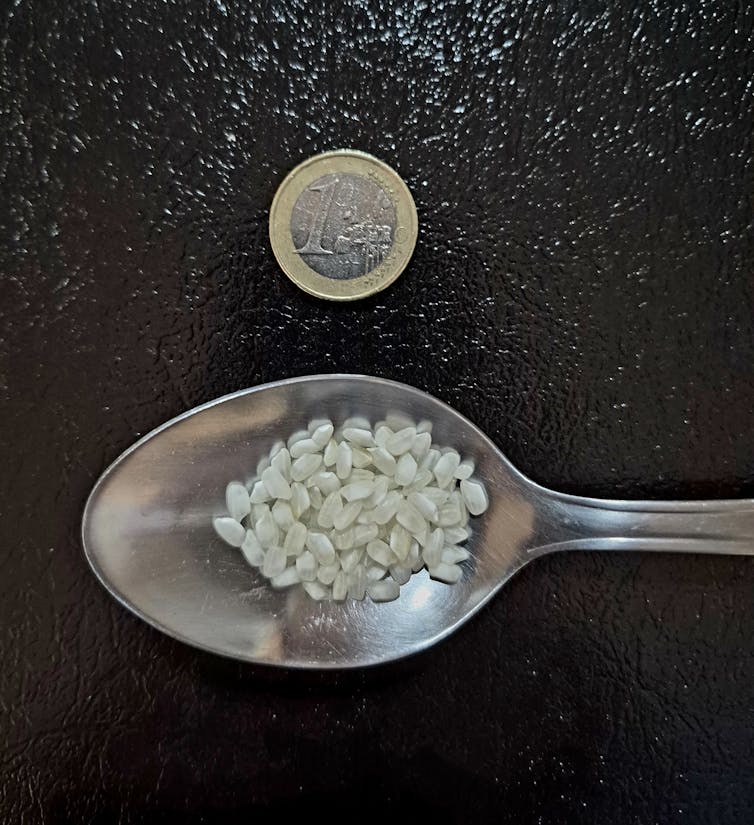 Para tener una idea de lo pequeños que son los granos típicos del arroz para paella, cuenta 100 granos y ponlos en una cucharada. Verás que queda mucho espacio libre. Estimemos cuánto pesan cien mil granos de arroz. En los artículos científicos sobre agronomía del arroz, se suele utilizar como medida de peso una unidad llamada PMG (peso de mil granos).