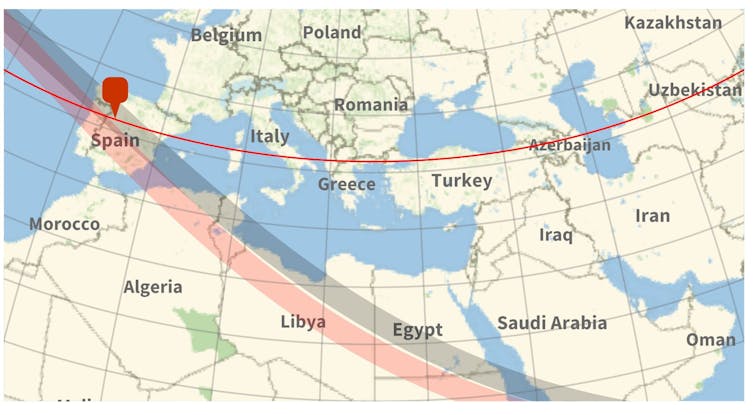 Eclipse Solar 12 de Agosto de 2026 Se muestra la barra donde el eclipse es total y las áreas donde será parcial. Autor proporcionado por el autor (no reutilizar)