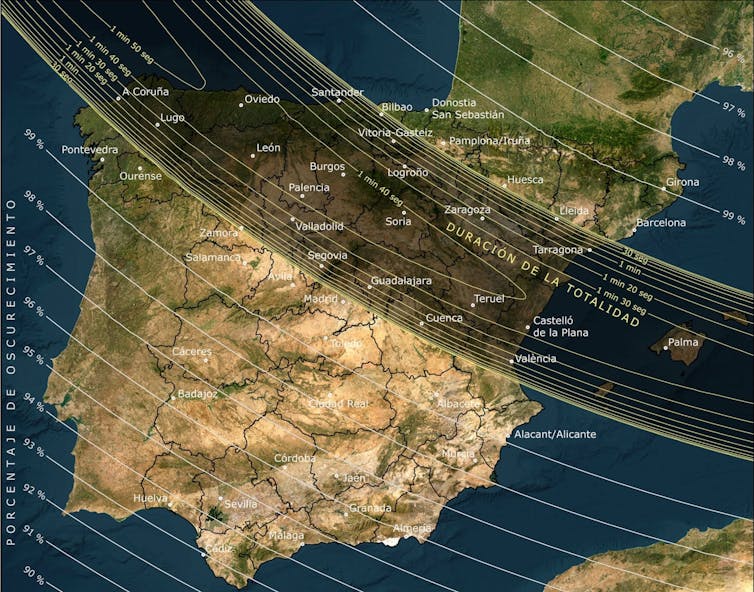 Eclipse solar 12 de agosto de 2026 Duración de la totalidad y porcentaje de parcialidad (donde el eclipse no es total). Instituto Geográfico Nacional